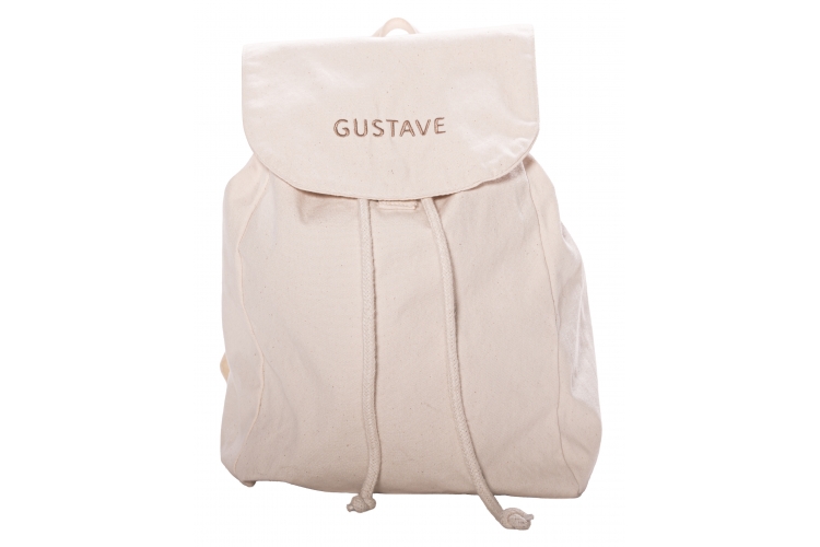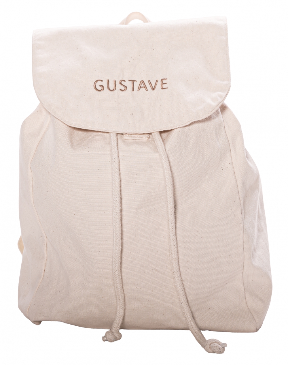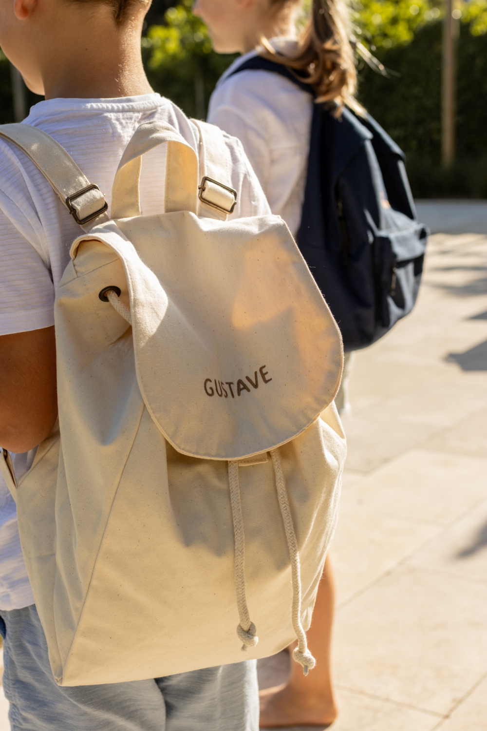 Omschrijving: rugzak in biologisch katoen, hoogwaardige zware stof. omvouwbare flap met drukknop, trekkoord sluiting