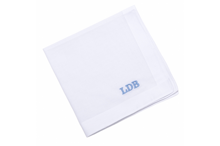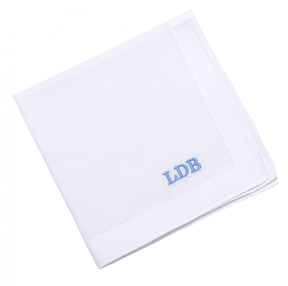 Omschrijving: witte mannenzakdoek met boord, borduring vrij te kiezen