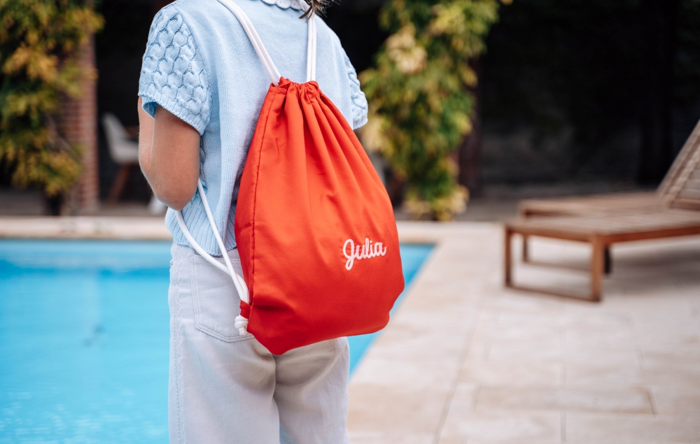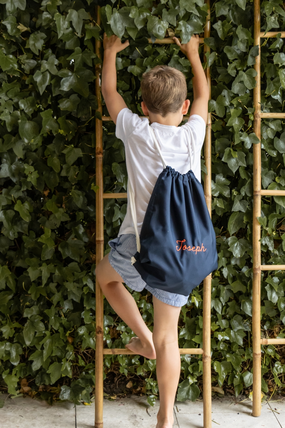 Omschrijving: zwemzak in polyester, voorzien van een zijzakje met rits. Witte, krachtige trekkoorden. Ideaal voor grote handdoek & zwemgerief